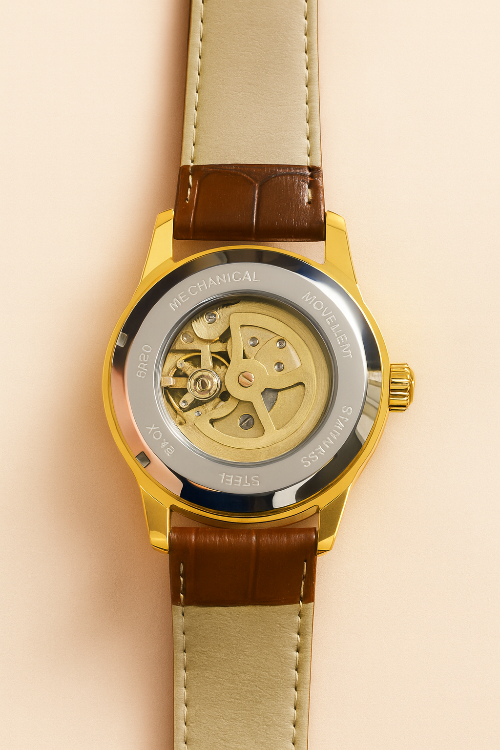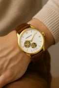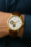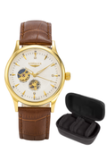 A refined automatic skeleton watch featuring an open-heart dial, genuine leather strap and timeless design — crafted for men who demand both style and substance.